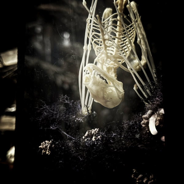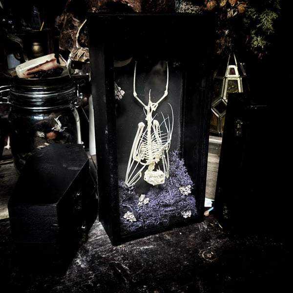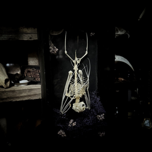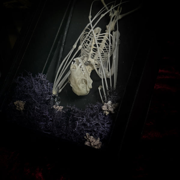 A fruit bat skeleton, laid to rest in this beautifully decorated case. The perfect oddity for bat lovers. Made in shop by Lou.