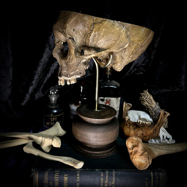 A partial medically cut human skull with a beautiful patina. It has been mounted on a custom made brass and wood display stand. Created in shop by Steve.