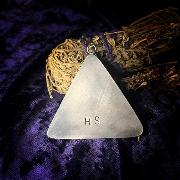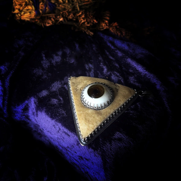A genuine deep brown/hazel Victorian glass eye, embellished in a triangular piece of human bone. A beautiful statement piece.