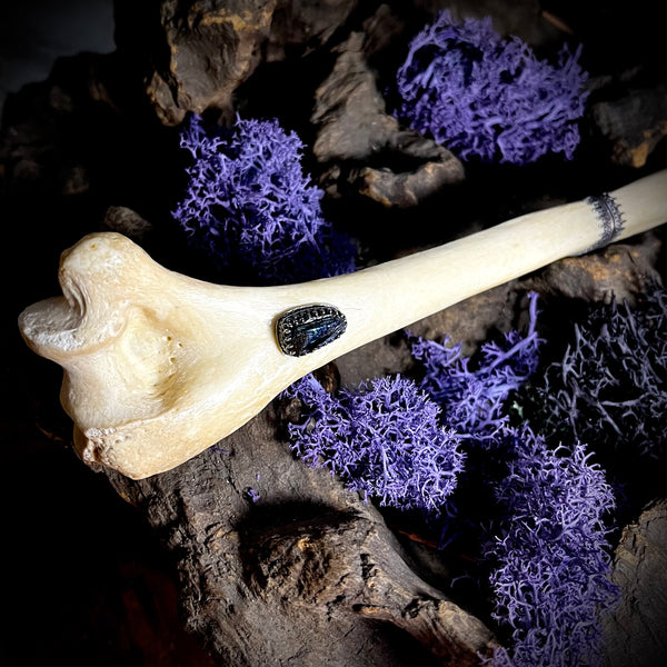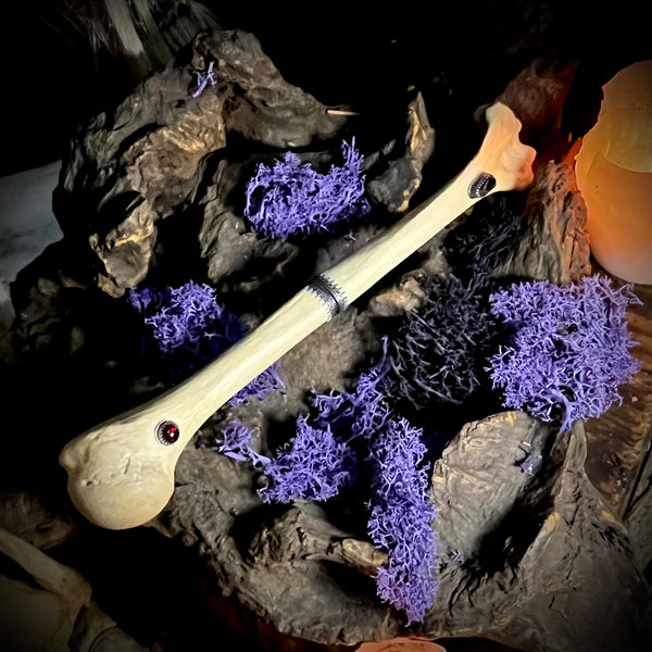 Athame dagger made from human humerus bone. Featuring vivianite and garnet set in silver gallery and a sterling silver blade.