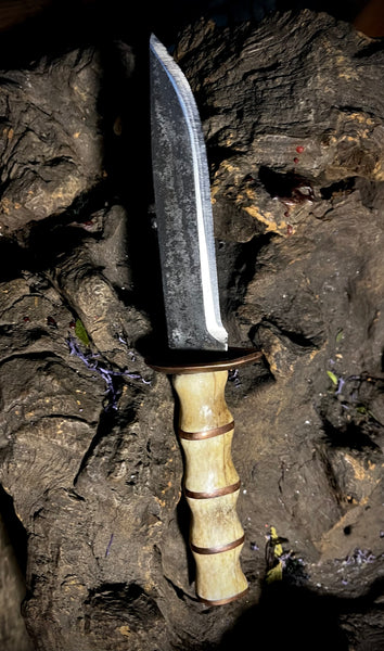 This here is knife, the handle is human bone and copper, the sheath is cow leather covered in human leather.