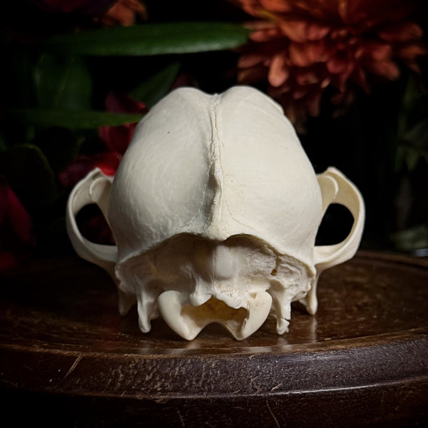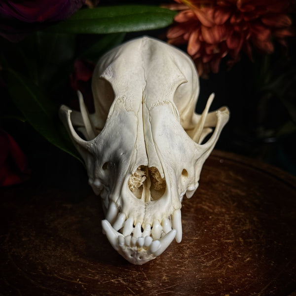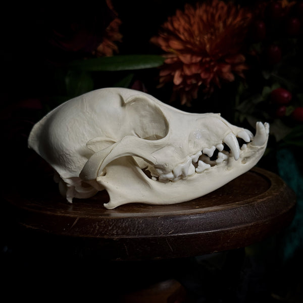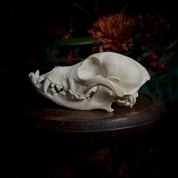 A Mongrel mixed-breed dog skull, with a condition where the lower jaw extends farther than the upper jaw. This is often a harmless, inherited trait and can result in the lower teeth protruding when the mouth is closed. A very cute and fascinating skull.
