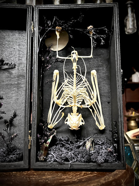 A fruit bat skeleton, laid to rest in this beautifully decorated case with dried foliage and moon carved from animal bone. The perfect oddity for bat lovers. Made in shop by Lou.