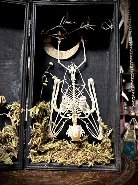 A fruit bat skeleton, laid to rest in this beautifully decorated case with dried foliage and moon carved from animal bone. The perfect oddity for bat lovers. Made in shop by Lou.