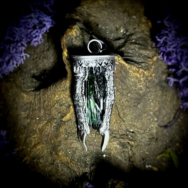 Sterling silver pendant featuring hand cast bird talons clasping a shard of vivianite (crystal of death). Handcrafted in shop by Xav.