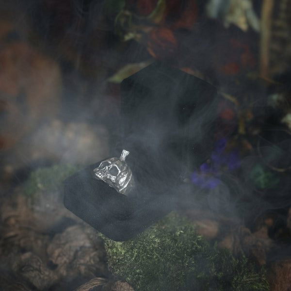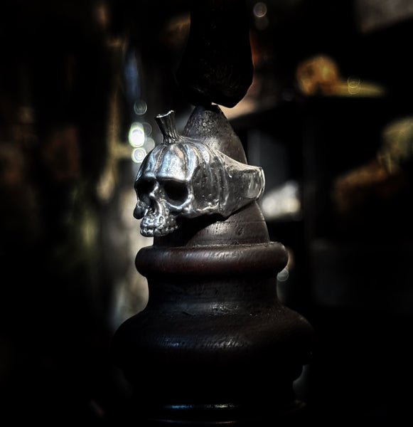 The “Cursed Harvest” Ring. A beautiful, solid sterling silver ring, embellished with an intricate skull-faced pumpkin. Handmade in the shop.