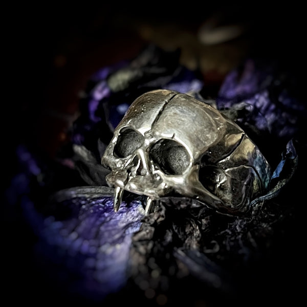 The Vampire Mortis Ring. A beautiful, solid sterling silver ring, embellished with an intricate foetal skull with fangs. Handmade in the shop.