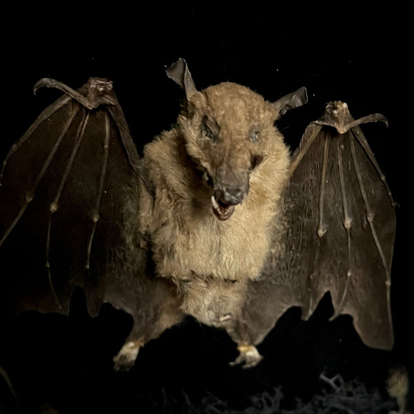 A chubby little taxidermy bat, flying high by a moon carved from animal bone. Made in shop by Lou.
