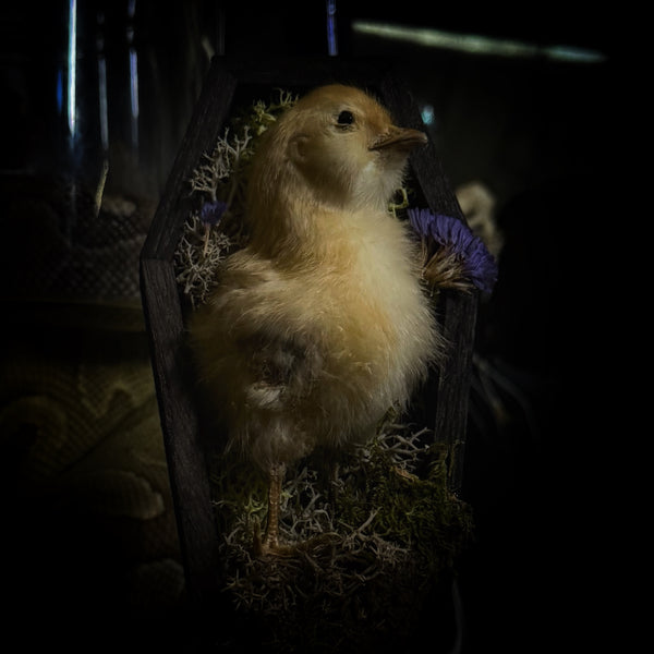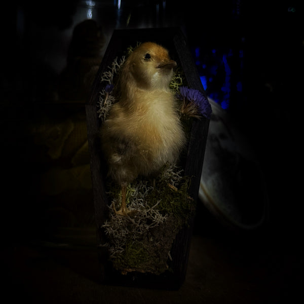A cute little taxidermy chick, mounted in a mini curio coffin.