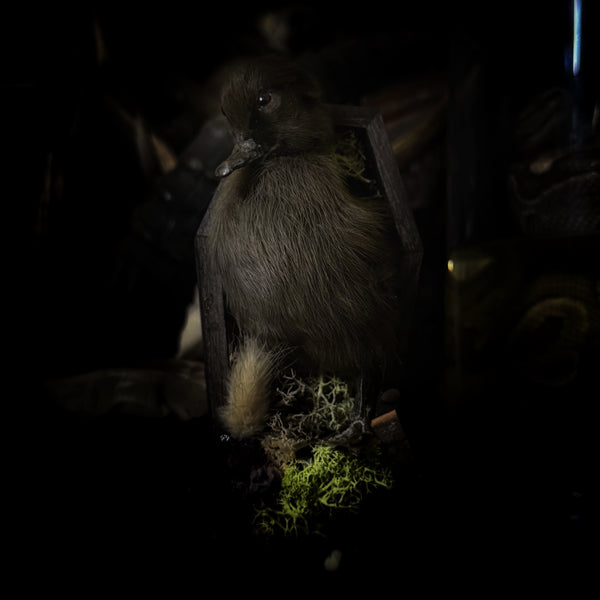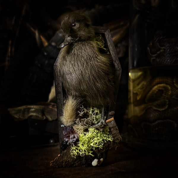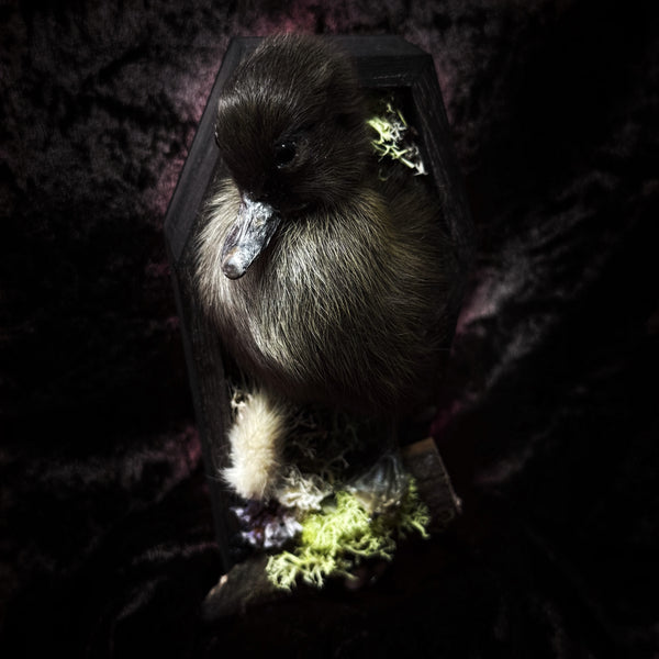 A cute little taxidermy duckling, mounted in a mini curio coffin.