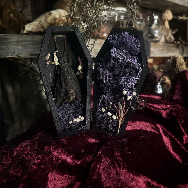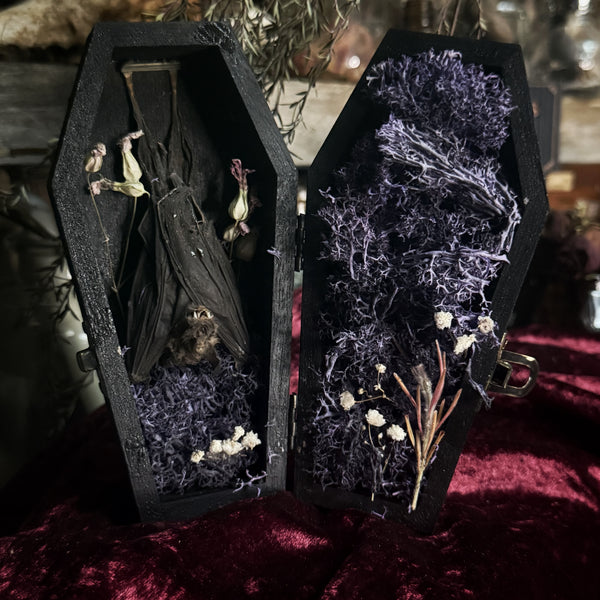 These tiny fruit bats have been laid to rest in these beautifully decorated mini coffins, can be closed for protection, or displayed openly for everyone to see. The perfect little oddity for bat lovers. Made in shop by Lou.