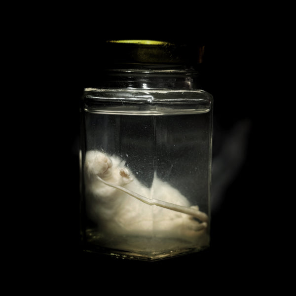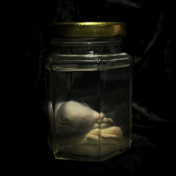 The cutest little white mouse, wet specimen. He really looks as if he is fast asleep in this jar!