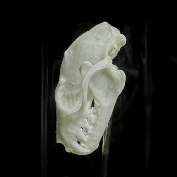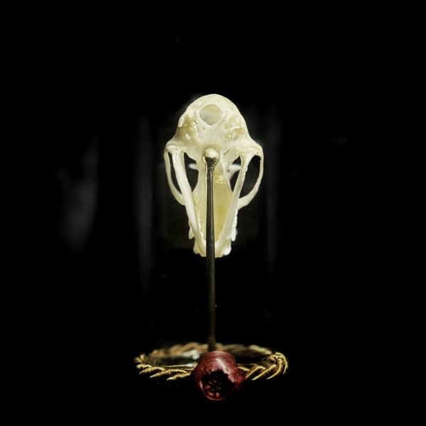 A Bat skull, mounted on a small brass stand, in a glass dome. Made in shop by Xav.